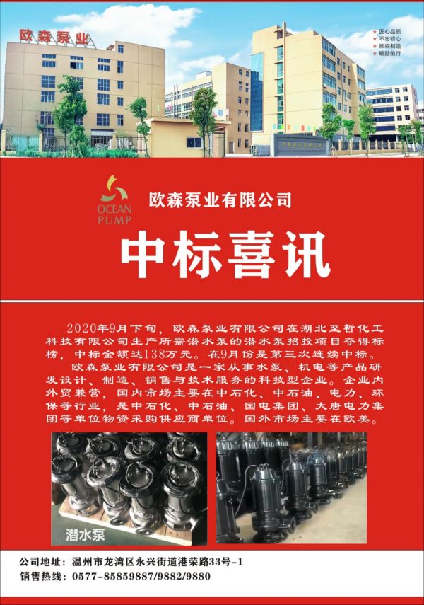 ? ? ? ?歐森泵業(yè)有限公司在2020年8月參加中石化西南石油工程有限公司西南工程2020年各型泵采購項目招標中成功獲中三個產(chǎn)品類型框架協(xié)議標。即為各型2潛水排污泵、各型3液下排污泵、各型4氣動隔膜
